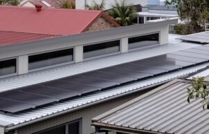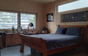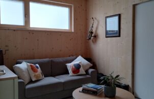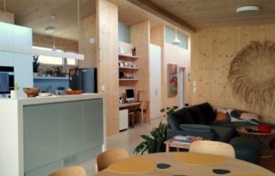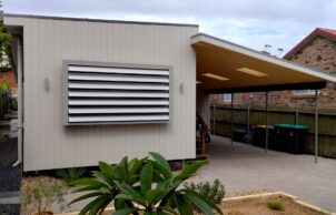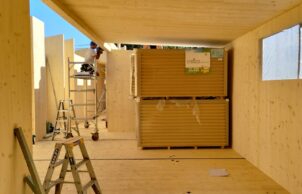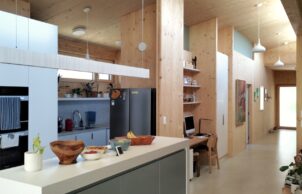 The exterior wall cladding is Weathertex which has a better than zero carbon footprint and is 100% natural (97% hardwood fibre & 3% wax) and is painted a light colour for maximum reflectivity. The roof is Colorbond steel, also light coloured. The large mass of sustainably sourced timber in CLT, wood fibre insulation and cladding – which sequesters carbon for its considerable lifespan and then may be dismantled, reused or recycled – offers a major offset against the carbon cost of other elements.