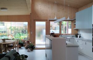 What followed was a meticulous process of completing seals on every joint and penetration of what is essentially a big solid timber box with triple-glazed windows and doors, then wrapping it in insulation, membrane and cladding. Airtightness is an essential component and our final blower door test gave an outstanding result of 0.12 ACH (Air Changes per Hour) which is well below the Passive House requirement of 0.60 ACH.