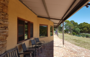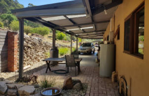 Our house at 650m elevation is in the north east Victoria ranges. We constructed our house using compressed earth bricks, many made on site. Walls are 250mm thick and the ceiling is heavily insulated, thus the house is thermally efficient (internally the temperature has rarely dropped as low as 8 degrees C, even when -5 degrees outside overnight for several days). The house design is simple with a north facing orientation. Verandahs surrounding the house are wide (2.6m) for weather protection, but are designed, on the north side, to allow winter sun to warm the slate flooring inside while protecting the walls from the higher, summer sun. We also planted deciduous vines to shield the west wall from the hot afternoon summer sun. We have double glazed windows, plus BAL 29 & BAL 40 rated external doors and window frames (all of solid timber). We have an combustion heater, but use a “split system” heater/cooler that runs off solar energy to minimize burning wood. We have a solar hot water system and we are powered by 9 kw of solar panels connected to a 10 kwh battery (however we are still connected to the grid and feed power back into this). All water is collected from the roof into tanks. The house is also designed to allow for complete wheel chair access and all tap and door fittings are levers suitable for people with hand issues such as arthritis (in case this eventuates).