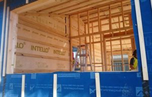 Walls are all externally and internally membraned, aiming for the Passive House requirement of 0.6 ACH (air changes per hour ~ i.e. the total volume of air moving through your home, thus how quickly any energy is lost through your building envelope). Pre-testing has come in at 0.67 ACH (Passive House FAIL) but, confident with the additional taping that has occured since then, the house will achieve the airtightness requirement.