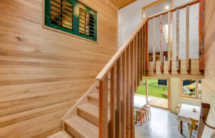 While material choice is important in an energy efficient home, orientation is just as important. Our architect ensured the principle living areas face the north and has designed the roof to maximise sun in the cooler months and omit it in the summer. With a north facing roof we can also fit plenty of solar panels. The concrete floor as well as the mud render on the strawbale both provide excellent thermal mass to the interior of the house. We’ve also used double-glazed timber frame windows and doors.