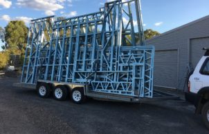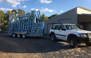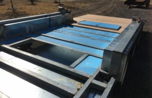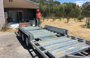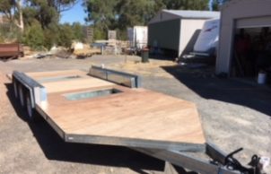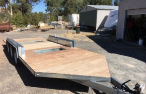 It will have a full kitchen in the front with stove, double-bowl sink, hot water and a full-height fridge; shower, toilet and sink, workbench, lounge, TV, etc.; solar-powered electrical system. The roof falls to the front allowing for water collection to serve the dwelling.