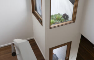 With the aim of preserving trees and maximising garden spaces, the extension occupies underused space to the south and is positioned hard against planning setbacks. The ‘tower’ has a small footprint, which retains a valued veggie patch and chook run.