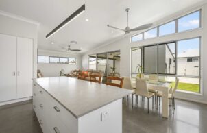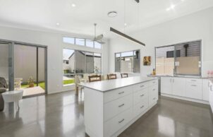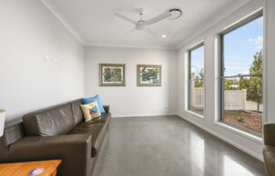 All the flooring throughout the living areas and the bedrooms is Polished concrete. This has enhanced the potential of harnessing the thermal mass of the concrete floor, helping to moderate indoor temperature fluctuations.