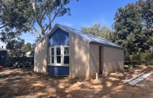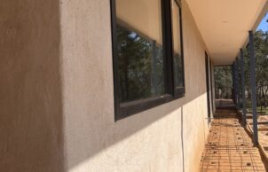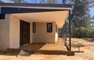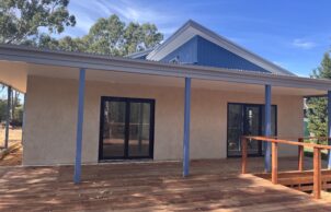 Our home is a Strawbale home constructed on the river flats of Avoca in the heart of the Pyrenees wire region . We worked with our Architect Denis to create a solar passive home to utilise the most of the block . The house features a Strawbale home constructed from sit up panels from the team at huff and puff . The builder chose to wrap the inside of the bales with a new building wrap from pro- clima to help keep with the temperate more on the plastered walls . Our home also feature’s a mud brick garage supplied and laid but the same guy Rory that also rendered the bales . Another feature of our home is a water tank under the front deck of the home as we don’t have town water access and we chose to put it under the deck so we had more garden space. The only gas connection in the house is for the cooktop, as the client, a former chef, prefers cooking with gas over induction. This is supplied by a single gas bottle dedicated solely to the cooktop.