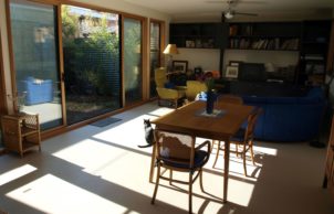 The exposed concrete slab floor provides thermal stability, and there are double-glazed windows throughout the house. Windows and doors are positioned to maximise cross-flow ventilation, and summer shading is provided by ornamental vines.