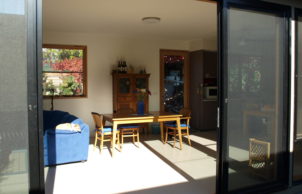 The house is almost self-sufficient in electricity and water usage. Solar PV panels (2.2kW) are installed and the entire roof area drains into a 7500L tank, which is plumbed to all taps except for the kitchen cold water.