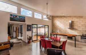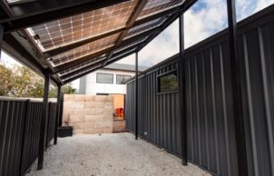 Water hasn’t been forgotten, and the house has 7000L of rainwater storage, a drought-tolerant garden, WELS-rated taps and fittings throughout, and efficient appliances. Landscaping is designed for water retention and, to reduce building materials, solar panels double as the carport roof.