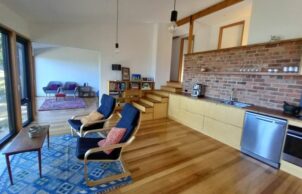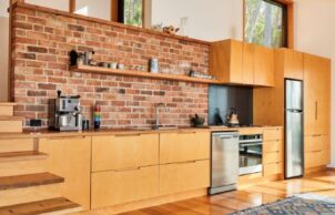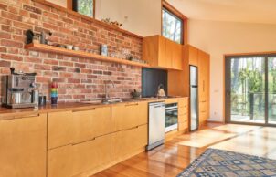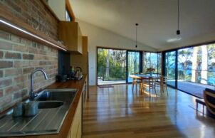 Uta also likes to use local or recycled building materials as much as possible, but says it is difficult to obtain them in Tasmania. Eaglehawk Nest uses recycled convict brick, plantation Silvertop Ash, steel, cement sheeting and some recycled Tasmanian Oak. The stone walls and landscaping use rocks from the site.