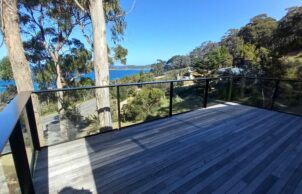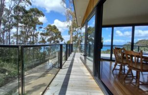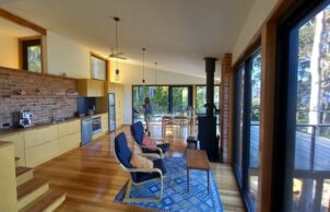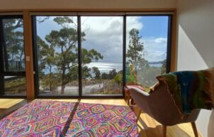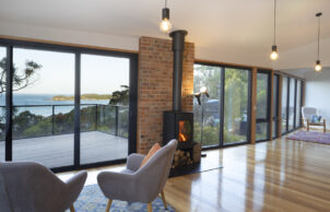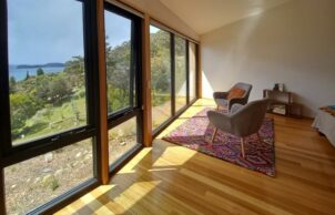 All rooms face the bay, and because the generous glazing faces East, overheating in the Tasmanian climate is unlikely. Thermally broken aluminum framed doors and windows with ember mesh have been installed for heightened energy efficiency and bushfire resilience, to BAL-40.