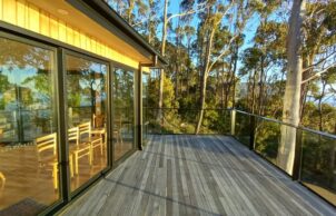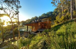 Clients come to Uta Green, from Green Design Architects, for her speciality in sustainable buildings and bushfire resilience. Building to a high BAL standard is often essential for the Tasmanian areas she works in, as was the case with Eaglehawk Nest.