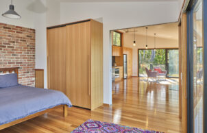 The house is a lightweight timber construction, with materials of low embodied energy throughout.