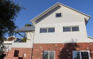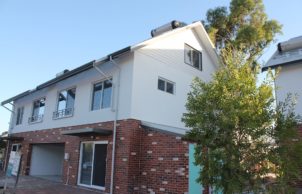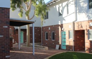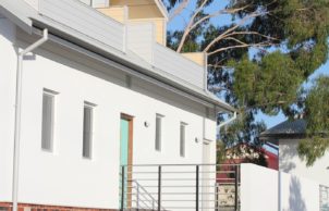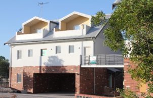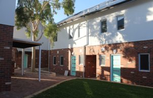 Community of mixed apartments and townhouses sharing communal gardens and bike storage. Extremely high energy efficiency (9+), Gold eTool rating, rain water capture and reuse, PV systems, solar hot water, single garage with provision for e-car, use of reverse brick veneer, double-glazed windows, rooms in loft spaces.