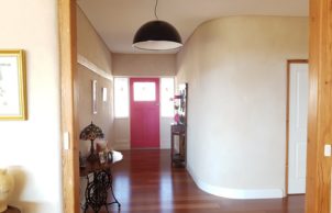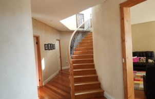Our house is a snail-shaped octagonal strawbale house. We were determined that it would be a strawbale house with a little bit of class. It is designed to be energy efficient, and to make full use of passive solar and natural light. The windows are double-glazed and there is generous insulation to complement the strawbales. The power system is off-grid solar with generator backup. It is a very comfortable house to live in and its efficiency has surprised us.