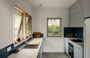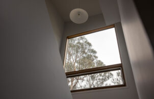 The client and I met through the Speed Date a sustainability expert hosted by Renew back in 2021. When the client initially approached me, his vision was to retain the small one bedroom post-war cottage, renovate and extend to produce a two bedroom dwelling with study which had the option for half the dwelling to be self-contained and rented out separately. Once I visited the site it became quickly apparent that retaining the existing asbestos ridden cottage and bringing the structure up to current bushfire building standards would be very costly and not the best use of the client’s funds. It was also quickly apparent that the site would have a high bushfire rating, at a minimum BAL 40 and possibly flame zone. The design approach then changed to demolishing the existing structure and rebuilding within the same building footprint over two storeys. Building within the same building footprint would also help get the project through planning which was likely to be somewhat tricky as the land is zoned Rural Conservation with a Bushfire Management Overlay. The approach with the design was to keep the room sizes as compact as possible and not waste a m2 of floor space. Strategies we used were; no island bench in the kitchen, pantry located under the stair cavity, one bedroom located on the ground floor with a shower and second toilet located in the laundry for future ageing in place, a double height void space can perform as a thermal chimney and provides the opportunity to throw light down into the ground floor spaces. The building form was also kept simple while still being interesting. This would help produce a tightly sealed building envelope which is important for thermal comfort while also being a key factor in bushfire resilient buildings.