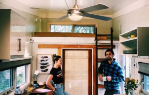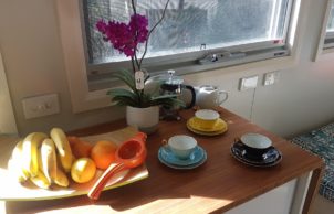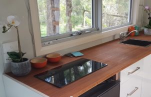 It has has ample room for sleeping, lounging, cooking and eating. It has a loft for extra space and a bathroom with composting toilet, vanity and shower. The Tiny House has been designed as a thermally efficient home with thermally broken, double-glazed windows, structurally insulated panels (SIPs), insulated floors, LED lights, instantaneous hot water, infrared heater panel, bamboo benches and plenty of storage. The Tiny House can be supplied with an 850–1000W off-grid PV system.