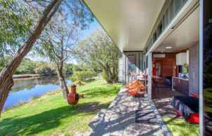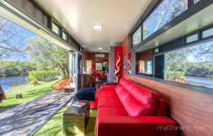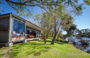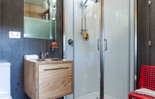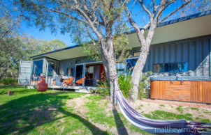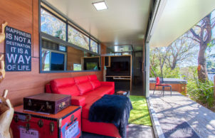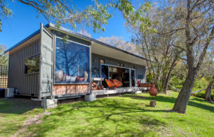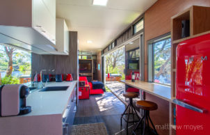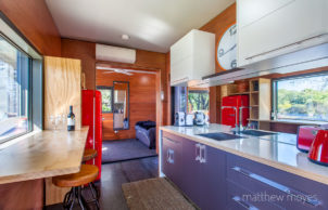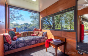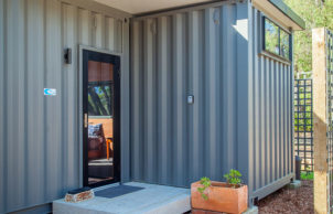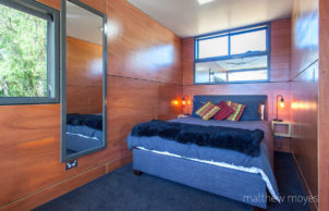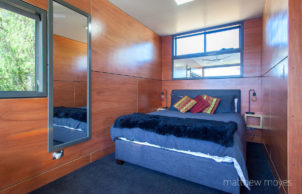 This home is built from recycled shipping containers. The 40ft container provides for kitchen, living, dining and bathroom, with a 6.5m double-glazed low-e glass stacker door that runs east–west, providing lots of natural light and winter sunshine to enter the home. This gives access to a Millwood composite decking, which again runs east–west for maximum winter sun while giving protection from summer sun. The 20ft container attached to the end of the 40ft in a T configuration provides the bedroom with a queen-size bed one end and a daybed with full-height and full-width window to the north, double glazed with low-e glass, providing a beautiful place to lie reading a book or gazing at the view, watching the wildlife whilst basking is some winter sunshine.