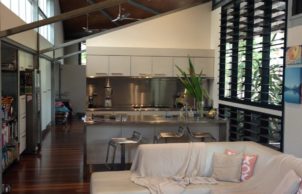Designed by Troppo Architects, this house features open living in a natural bush land setting. The tropical design includes high ceilings and floor to ceiling ‘walls’ of louvers to maximize cross ventilation and take advantage of cooling breezes. An up-sloping roof on the deck promotes unobstructed views of the surrounding bush land and the sunrise to the east and sunset to the west. The house incorporates a 4.5 kW solar panel system, LED lighting and salvaged timber.