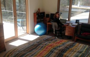 We wanted a modern house, not fancy, that would be low maintenance, energy efficient, taking full advantage of the sun, and very pleasant to live in. An upstairs main bedroom-study, looking east to Mount Macedon. For ageing in place, upstairs potentially self-contained, if we move downstairs.
