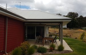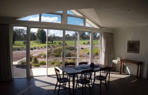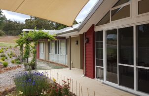 Our passive solar home on a semi-rural property was designed and orientated to maximise northern exposure as well as views down the valley to the south.  In summer, sails and deciduous vines shade the northern windows and double glazing to the south keeps the ambient heat out. The long, narrow floor plan with excellent cross ventilation allows quick flushing of any warm air as the sun goes down, using the south-west breeze up the valley.