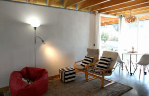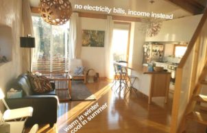 The combination of passive solar design, strawbale walls, insulated sandwich roof panels and double glazing make the house comfortable all year round – without the need for heating or cooling. Together with the solar hot water, solar PV, efficient lighting and appliances, this house generates more power than is used by its five occupants.